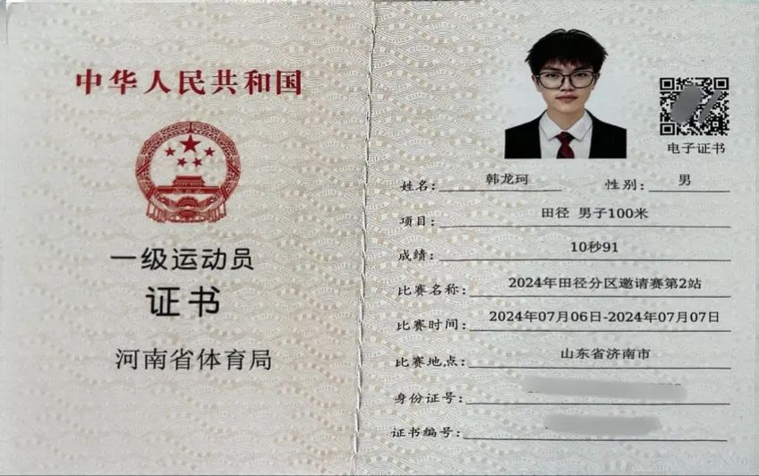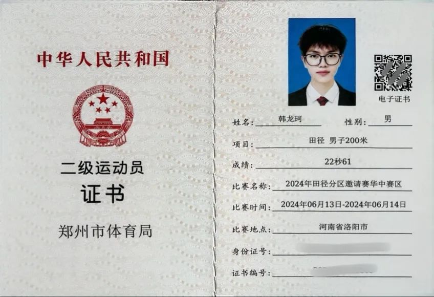 近日,我校体育教育系23级03班学生韩龙珂,凭借不断地科学锻炼,在国内多项田径赛事中的男子100米、200米项目上斩获了优异名次,经河南省和郑州市体育局审核,成功获批国家一级、国家二级运动员称号。