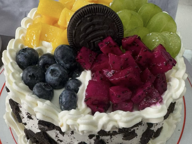 这款蛋糕是一场味觉与视觉的双重盛宴。它有多种鲜果,色彩缤纷如彩虹洒落,既带来了水果的清新酸甜,又有奥利奥的香脆,每一口都是多重风味的巧妙融合,仿佛把四季的鲜果美味与经典的饼干香甜都浓缩在这一方甜蜜之中,是创意与美味碰撞出的精致甜品佳作。